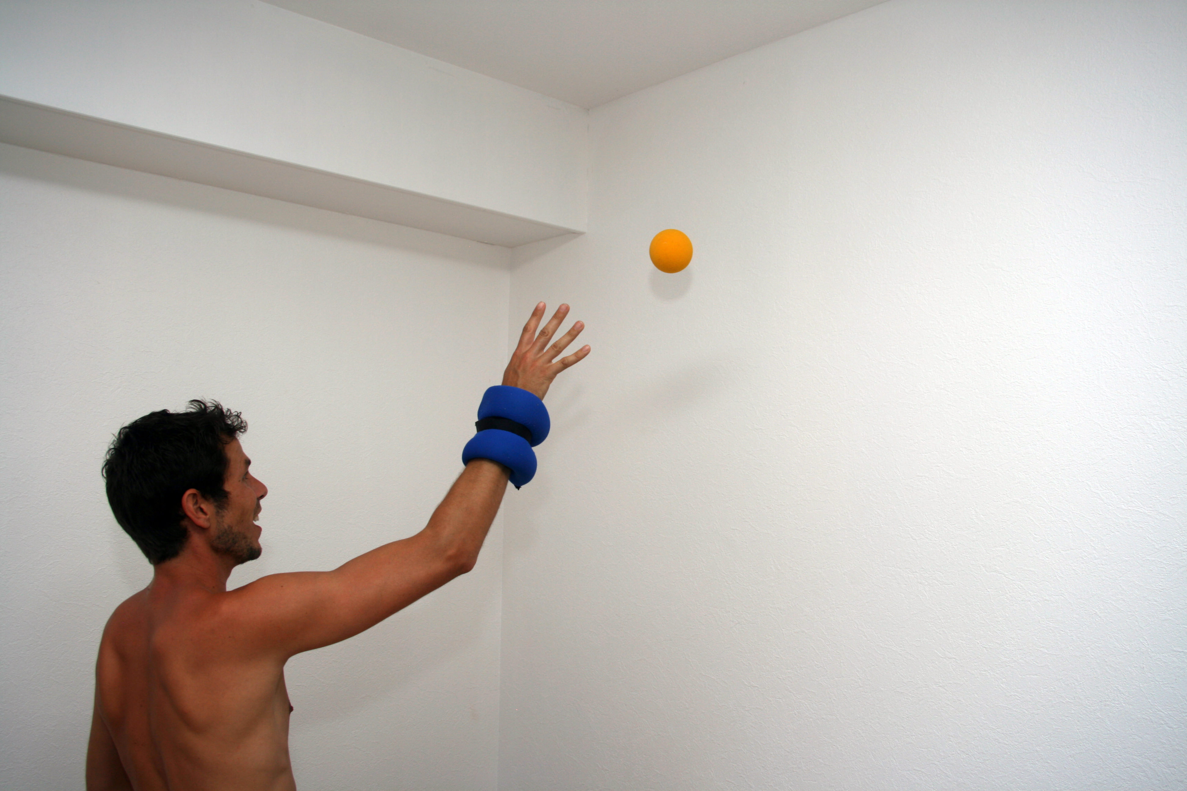 • A l’aide de l’autre main, réaliser une élévation de la main vers le dessus de la tête, en gardant les coudes pliés
