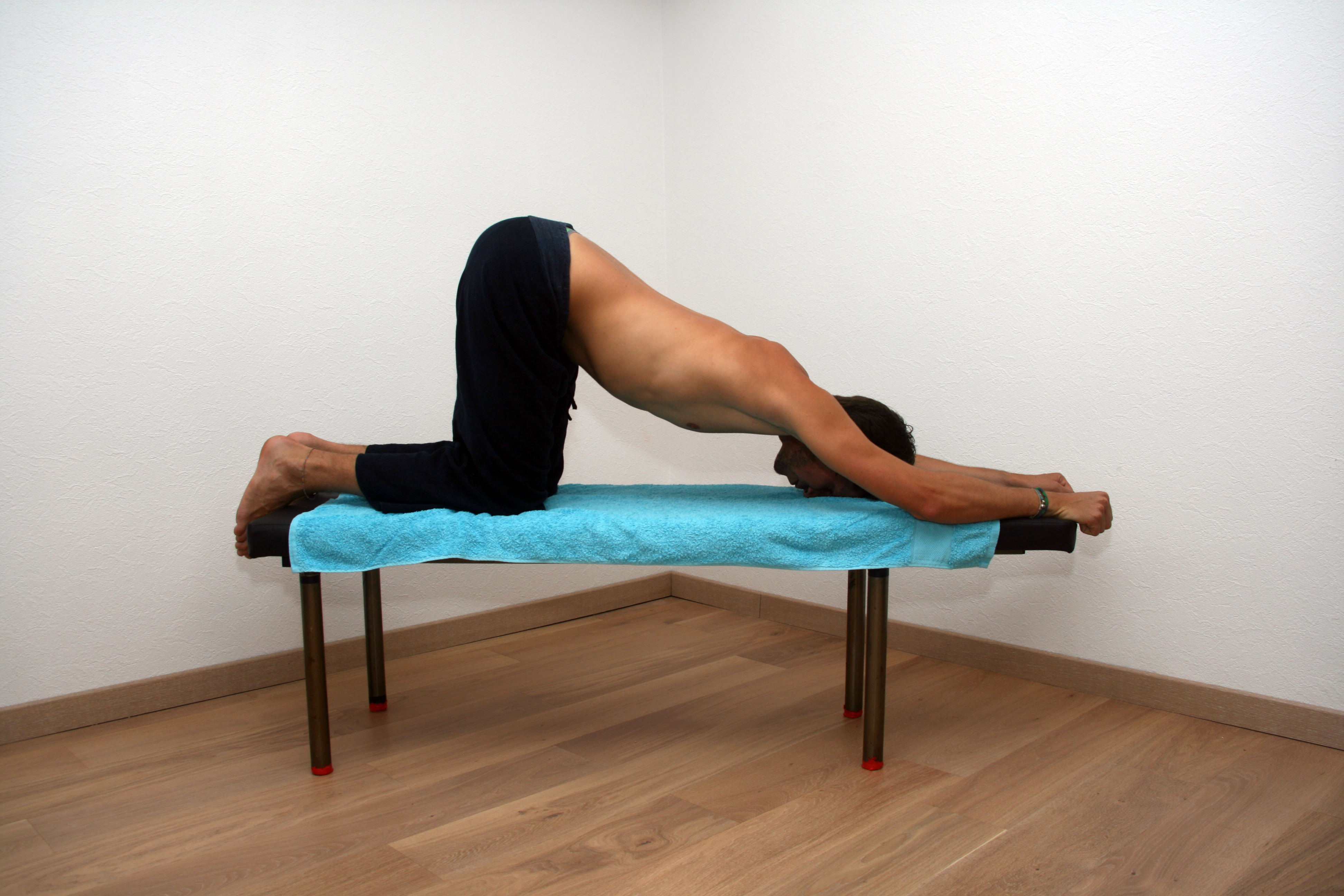 - Front posé sur le sol, mains et bras tendus au-dessus de la tête